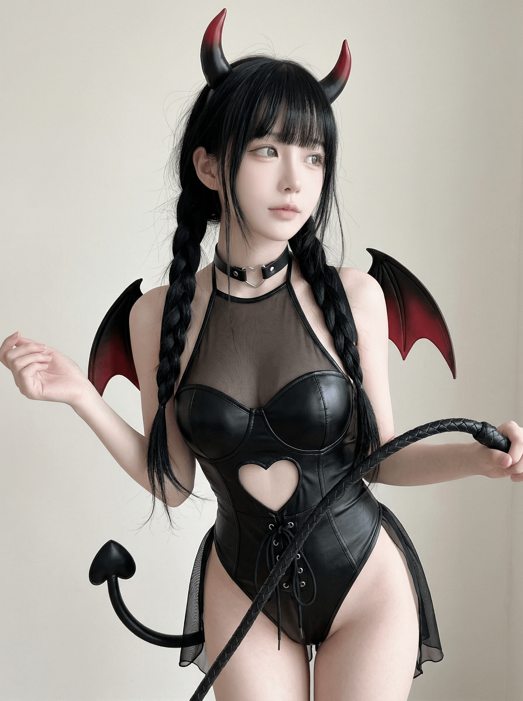 "accessories": "Black leather choker with silver buckle and heart pendant; black-red gradient devil horns; black-red gradient bat-style devil wings; curved black smooth devil tail."