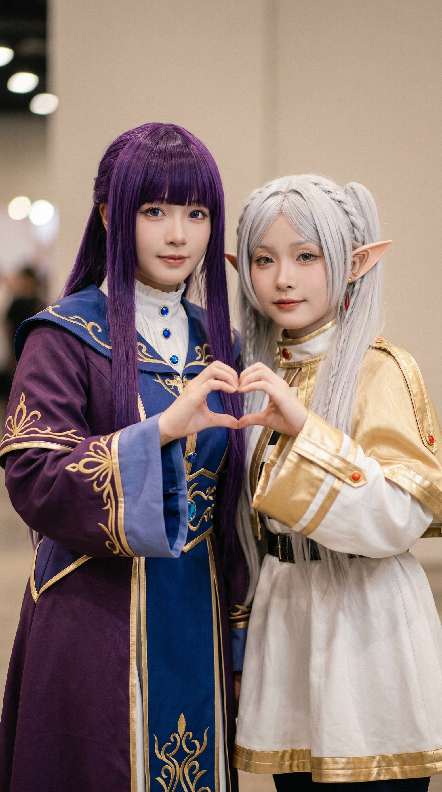 "description": "The woman is a beautiful professional Chinese anime cosplayer. Based on , create two versions of the same woman standing close together like twin cosplay characters, both clearly sharing the exact same facial identity, skin tone, eye shape, nose, lips, and overall proportions from the uploaded portrait. One version (Fern style, taller) wears a deep purple, long straight wig with a full fringe; the other version (Frieren style, shorter) wears a long, silvery-white wig styled with partial braids and prominent elven ear cuffs. They stand shoulder to shoulder, bodies angled inward, and form a heart shape together with their hands at the center of the frame.",
